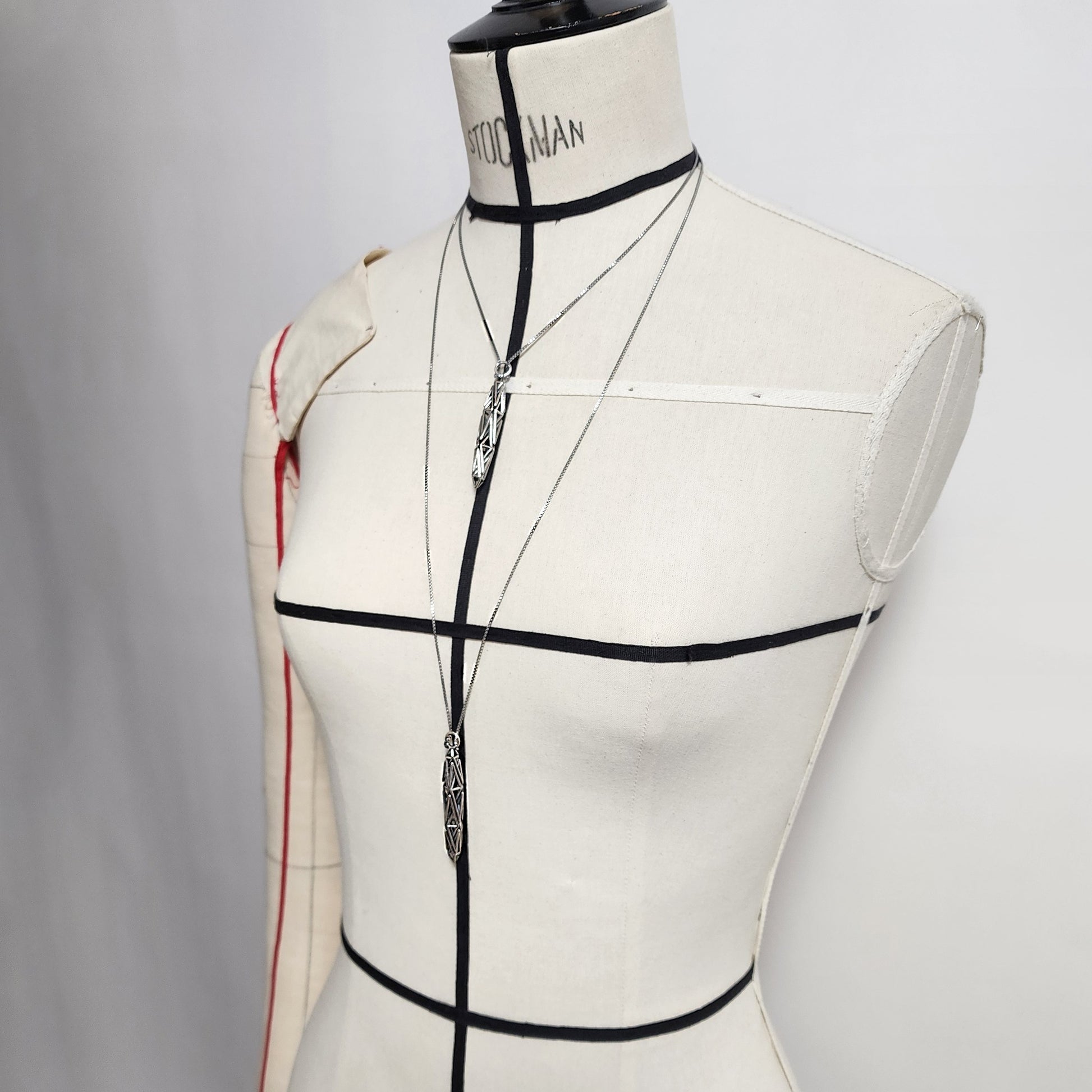 The Darius Pendant necklace features a prismatic volume filled with web of continuous angular detail. Crafted from solid .925 sterling silver, this long dramatic spindle is suspended from an 18 inch box chain secured with a sturdy lobster clasp.